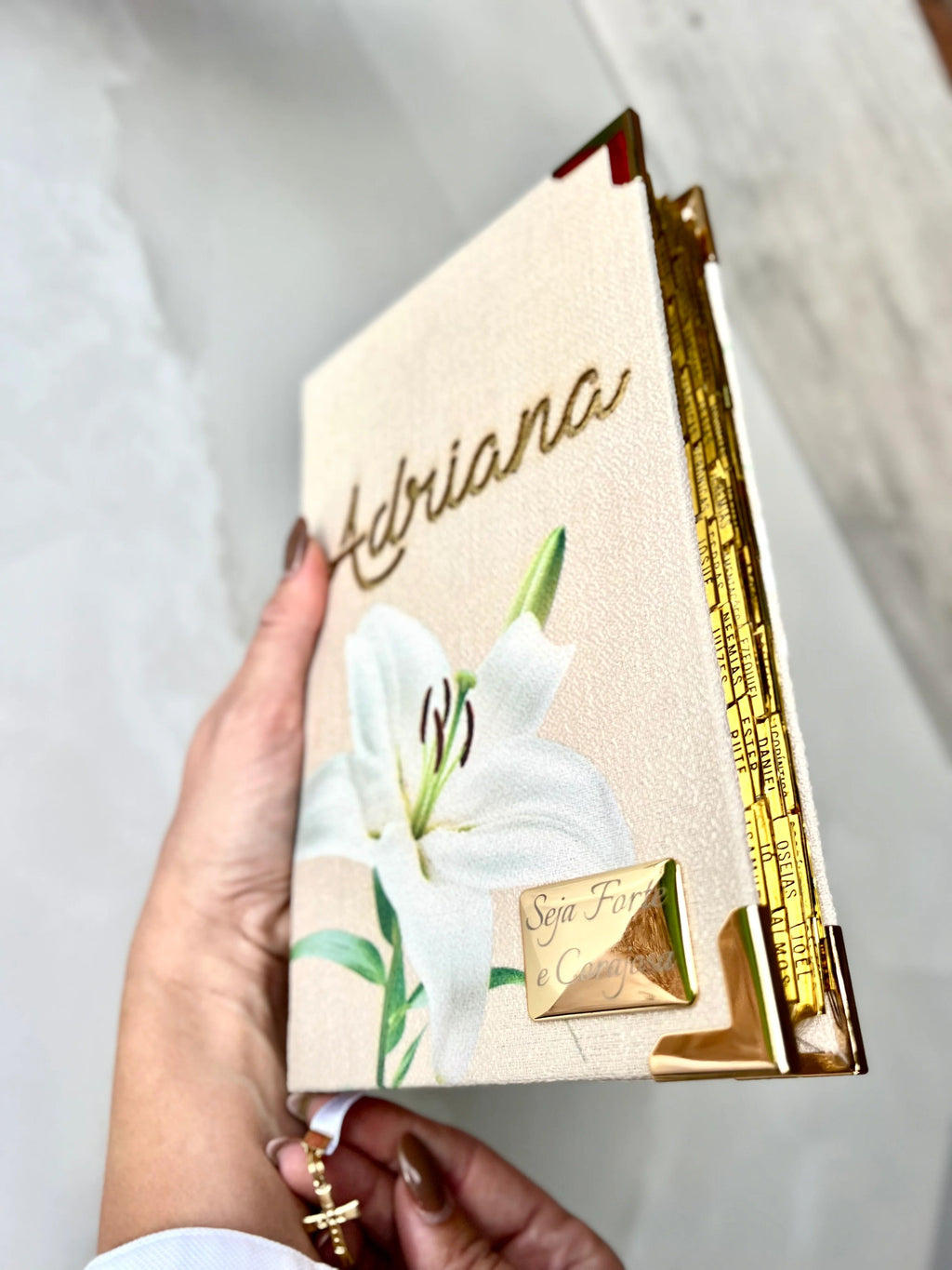 Bíblia em tecido personalizada com nome na frente, composta com Lírio. Finalizada com cantoneiras banhadas douradas e uma fitinha de cetim com pingente de cruz.